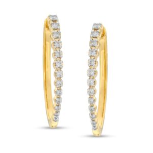 With eye-catching shimmer, these clever diamond hoop earrings are certain to stand out. Crafted in warm 10K gold, each pleasing hoop showcases a row of diamonds graduating in size from largest at the top to smallest at the base. Captivating with 1/2 ct. t.w. of diamonds and a bright polished shine, these earrings secure with hinged backs.