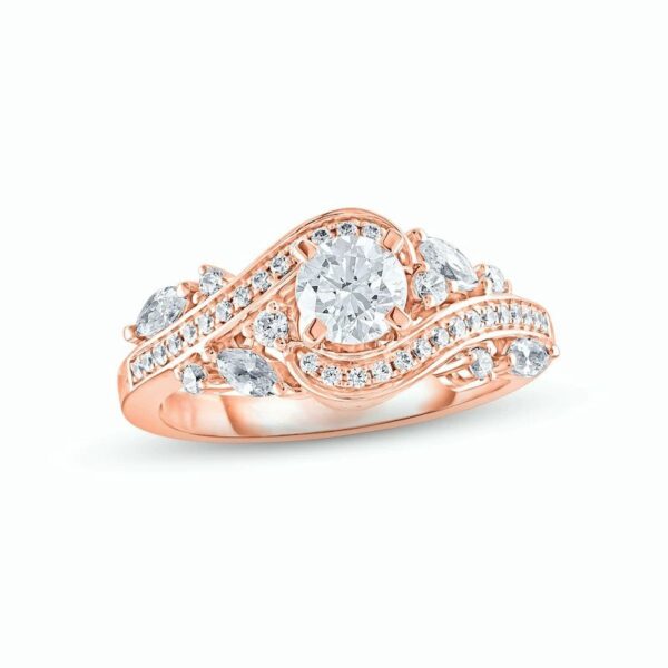 Celebrate her beauty and your unforgettable love with this enchanting diamond engagement ring. A breathtaking round diamond centers the ring and shines among the twisting rows of sparkling round diamonds that adorn the crafted 14K rose gold band. Luxurious marquise diamonds are embedded between the rows of round diamonds, giving this ring a classic yet modern look with a total diamond weight of 1 carat. Available online while supplies last. Previously Owned Treasures are not eligible for in-store pick-up. Previously Owned Treasures may only be shipped either to your home address or to an alternate address.