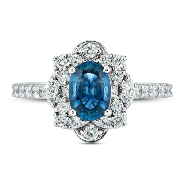 Please note: This ring is available in limited sizes. If you dont see your size here, please visit a store to order your ring.This enchanting ring features a beautiful natural Blueberry Sapphire haloed by irresistible Vanilla Diamonds set in powerful platinum. Additional Vanilla Diamonds line the band to complete the look. The total diamond weight of the ring is 5/8 carat.